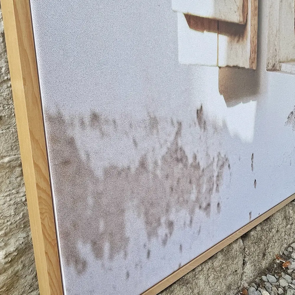 Imagen impresa en canvas 100% algodón y libre de ácido made in germany 340 gsm/2 + montaje en bastidor de madera de 2 pulgadas y enmarcación en mañio natural tipo cajón 20x43mm con cera natural.
