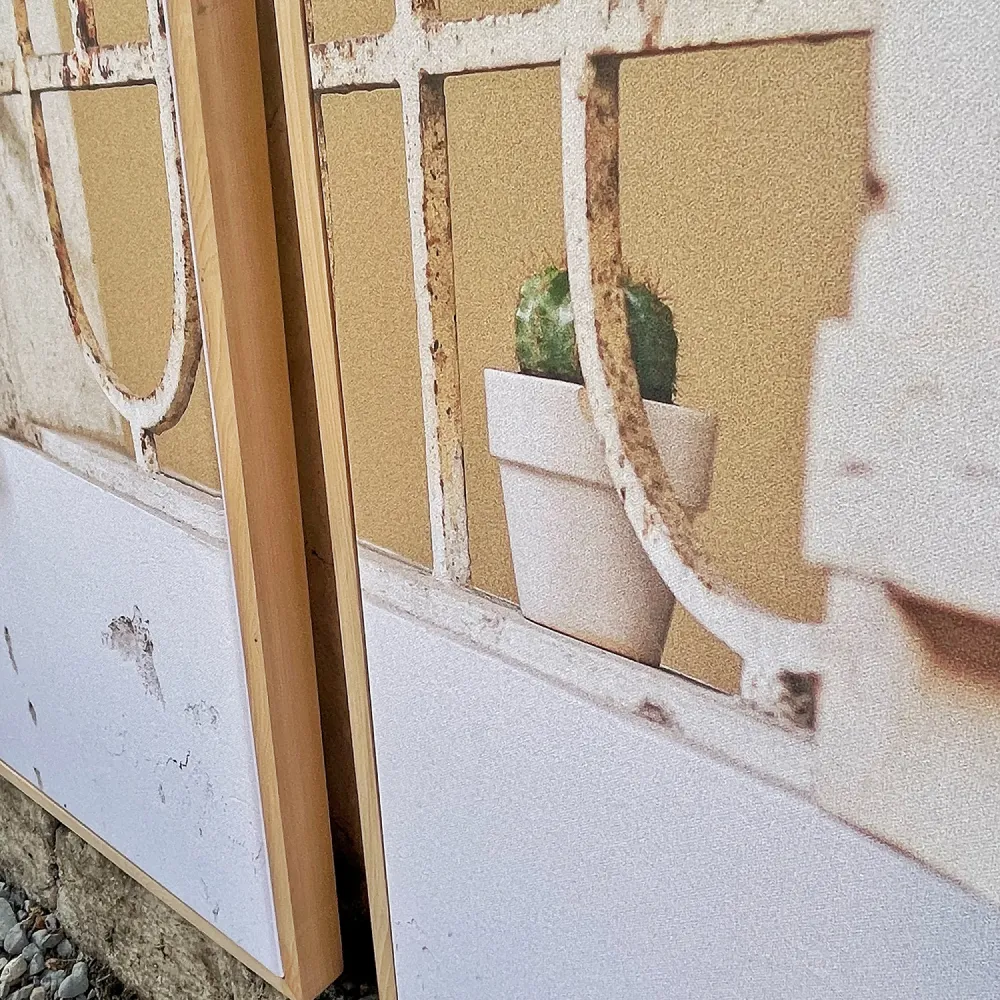 Imagen impresa en canvas 100% algodón y libre de ácido made in germany 340 gsm/2 + montaje en bastidor de madera de 2 pulgadas y enmarcación en mañio natural tipo cajón 20x43mm con cera natural.
