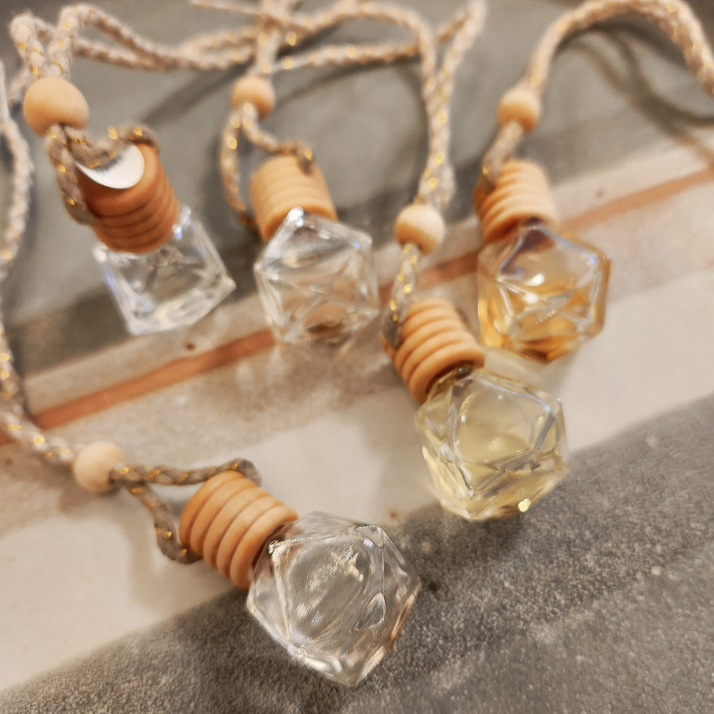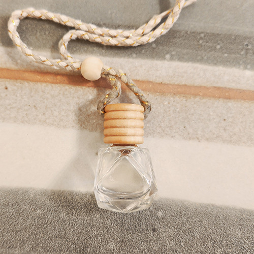 Difusor de auto en envase de vidrio transparente y tapa de madera de 8 ml.