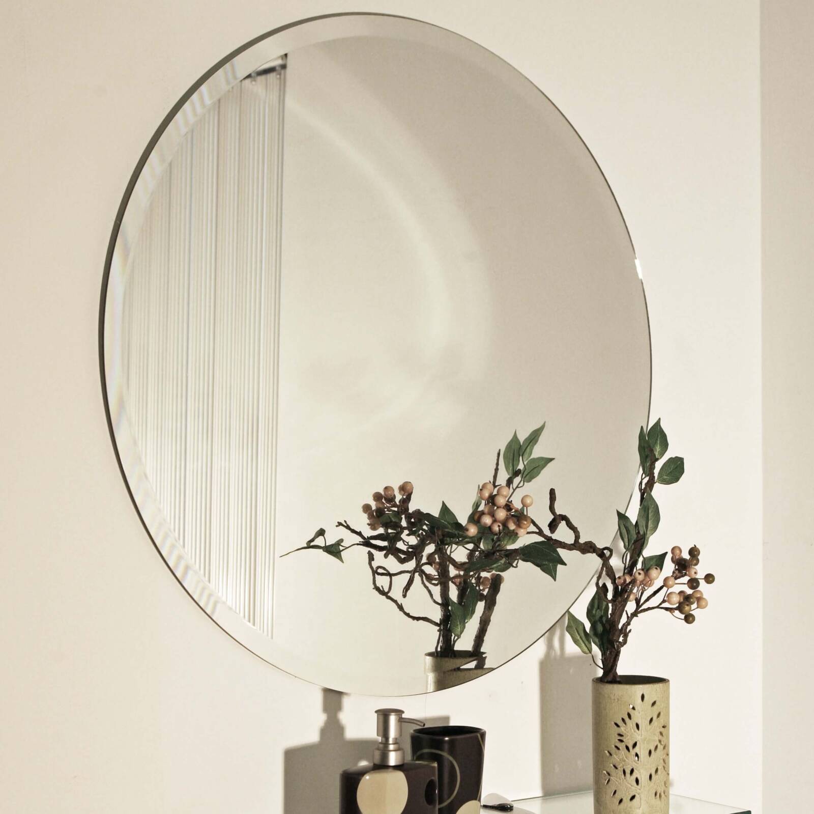 Espejo Redondo con cantos pulidos y bordes biselados.